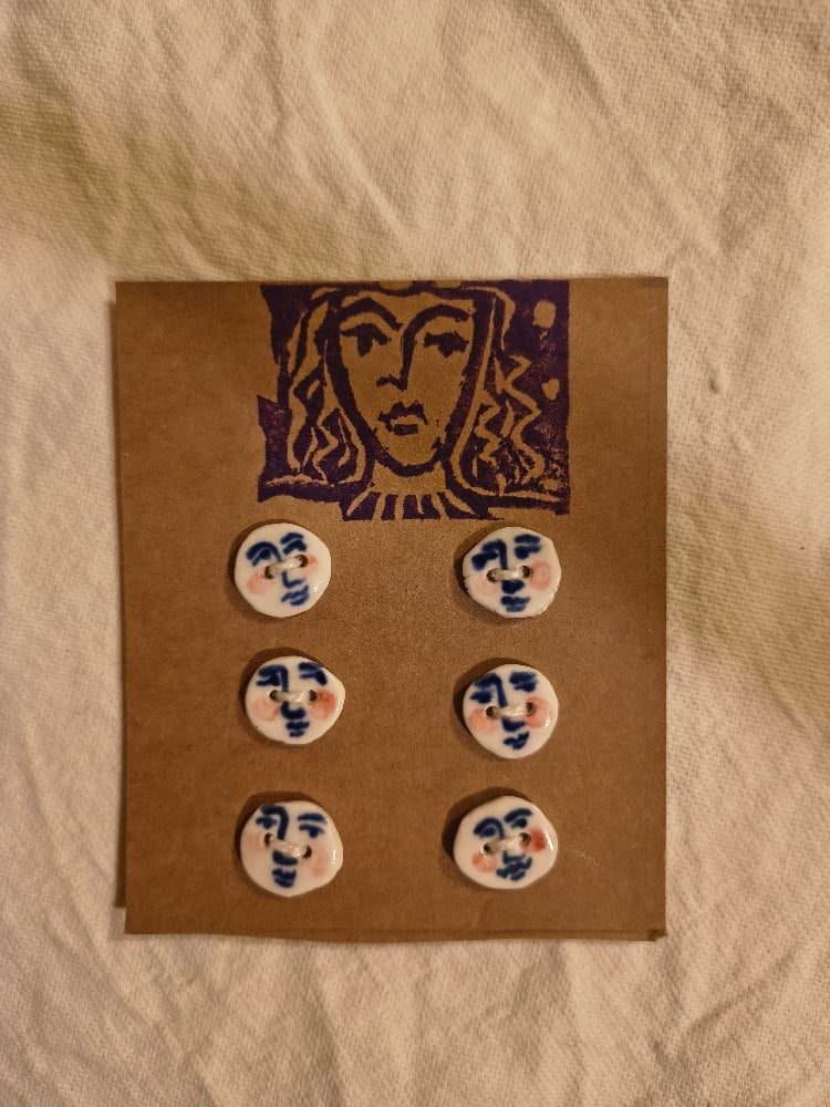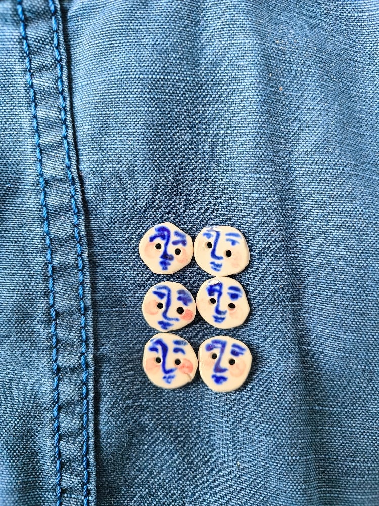 These stoneware face buttons are 1.4cm diameter. They are entirely handmade and hand painted, so each set will be different. They are white and dark blue faces and pink cheeks..