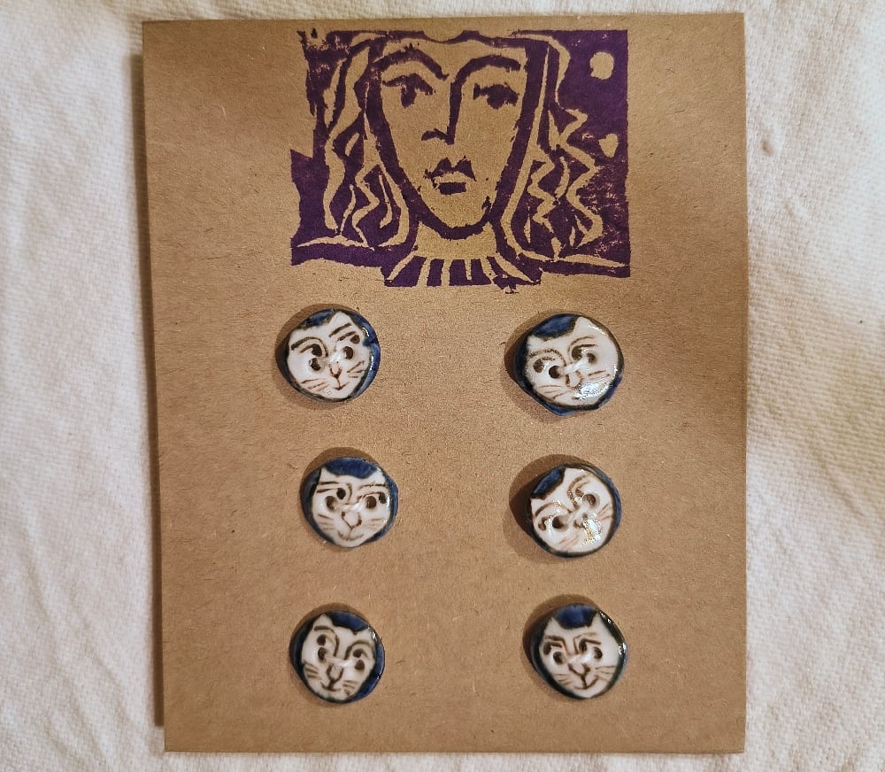 These stoneware cat face buttons are 1.3cm diameter. They are entirely handmade and hand painted, so each set will be different. They are off white, cats drawn in dark brown with dark blue around the face.