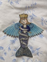 Catriona is a winged sea creature - it's the best of both worlds. Although she is a siren, she is a protector of all small boats and sea birds. She carries a sea gull and a banner, 'Speed bonnie boat like a bird on the wing', from the Skye Boat Song. She wears a crown and a bodice with a lace collar. I make and hand paint each piece, so Catriona is unique. She has a secure hanger on the back. She measures approximately 15cm from wingtip to wingtip and 16cm from crown to tail.X 14cm. I always post via Royal mail, first class.