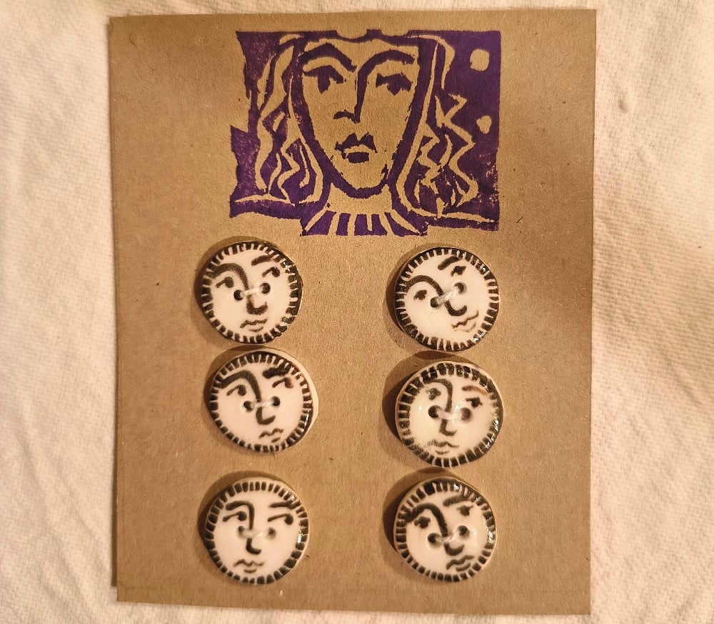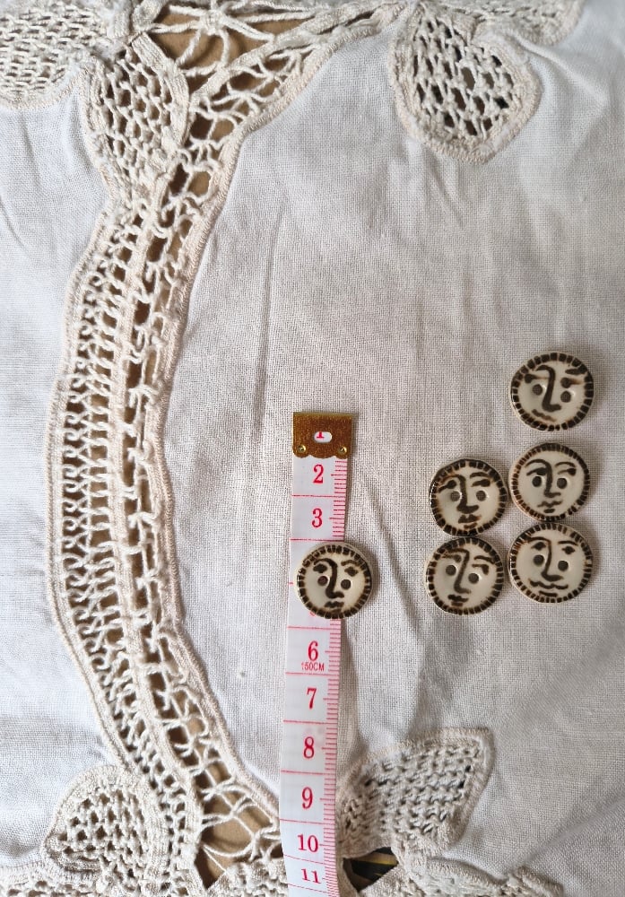 These stoneware face buttons are approximately 1.8cm diameter. They are entirely handmade and hand painted, so each set of 6 will be different. They are white and very dark brown.