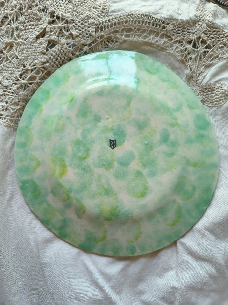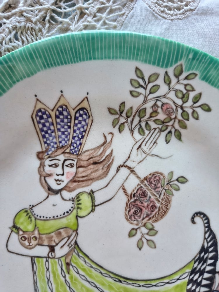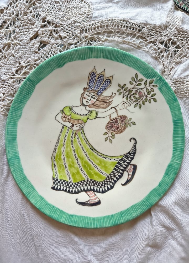 This plate features Rosa holding a basket of roses and her faithful cat companion. She waves a branch of roses. She wears a tall patterned crown and a watch; her empire line dress is patterned in soft shades of green, she wears stripy socks. The plate has lines painted on the rim and is sponged in greens on the back. It is handmade and hand painted, it's a one off.